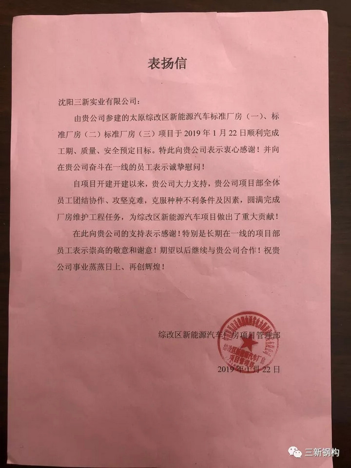 項目經(jīng)理邢玉寶代表工程項目部作太原項目總結報告。2018年,在公司上下鼎力支持下,工程項目部發(fā)揚打硬仗能吃苦的精神,克服任務重、工期緊、要求高等困難,圓滿高質(zhì)量按工期完成任務,在工程施工技術管理方面取得可喜的進步和成績,受到山西綜改區(qū)新能源汽車項目管理部的好評,并致感謝信。