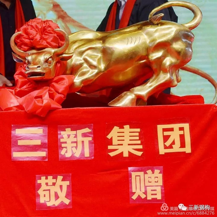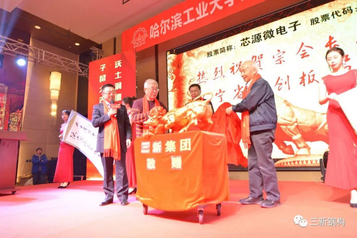 本屆校友會的承辦方,沈陽三新集團總經(jīng)理,校友會副會長,本屆年會籌備組組長洪長禧先生代表沈陽校友特為宗會長及芯源微電子贈送銅牛一尊!祝芯源微電子財源廣進,牛市長紅!