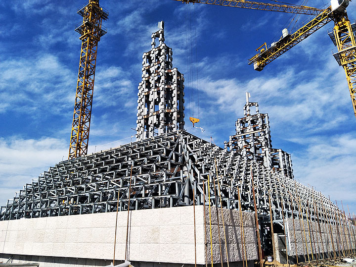 黃帝問道大項目是“帝師之鄉(xiāng)”汝州的重點大型城雕項目,也是當?shù)氐貥诵越ㄖT擁椖考缲撝霌P汝州歷史文化和華夏文明的重任,承載了太多榮耀和希冀。雕像基底面積1400平方米,人像總高度59.8米,主體結構采用圓管鋼框架,外側采用干掛石材雕塑,總用鋼量2300噸,設計使用年限為100年。雕塑內部水、電、消防配套齊全。要用鋼結構、石塑傳神地塑造中華民族敬為人皇的黃帝雕像,不失神韻和靈氣,其難度可想而知。三新不負重托,攻克所有的技術難題,把大師畫卷中的意象用建筑語言完美呈現(xiàn),體現(xiàn)了三新建筑技術與藝術完美融合的建筑理念。施工過程中汝州市政府各級領導多次到現(xiàn)場檢查指導,對工程質量贊賞有加。我們一起見證了精品的煉成,其中凝聚了三新人的心血和智慧,更體現(xiàn)了三新的創(chuàng)新精神。如今被評為“中國鋼結構金獎”工程,更是實至名歸。三新帶您一睹黃帝風采,領略華夏文明。
