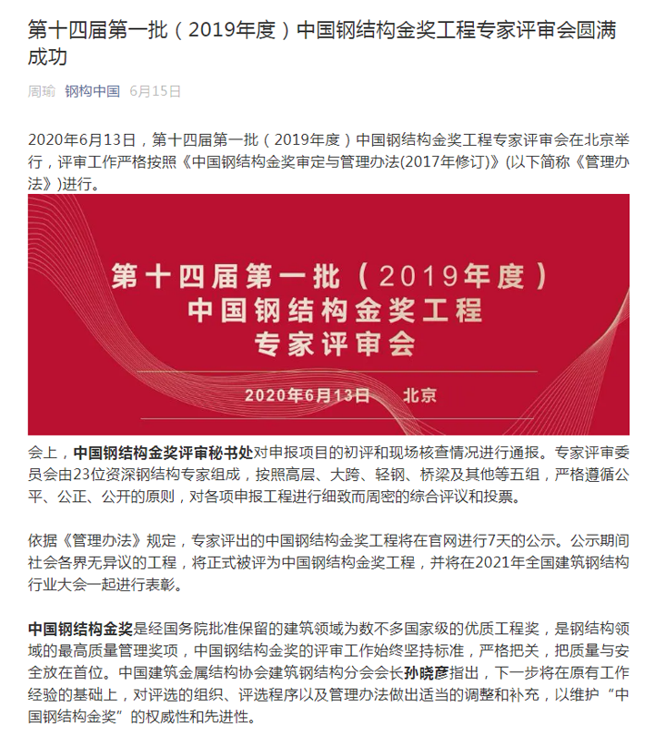 2020年6月13日,第十四屆第一批(2019年度)中國鋼結構金獎工程專家評審會在北京舉行。