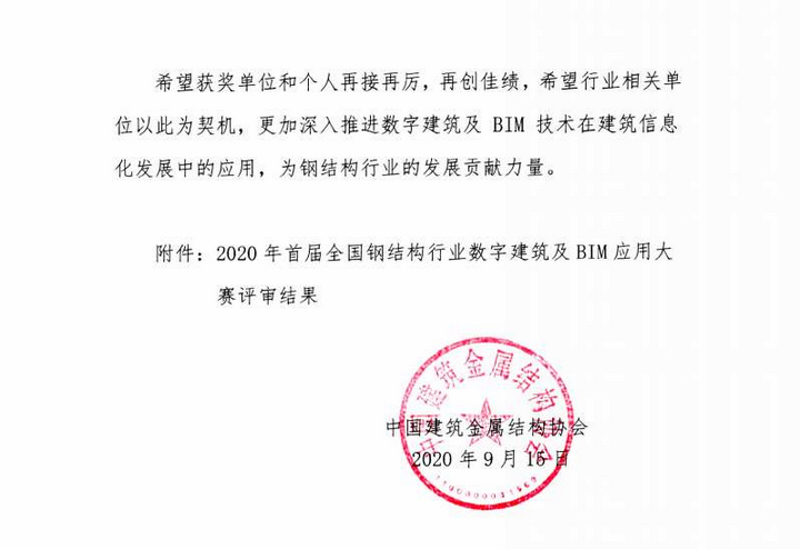 本次大賽由中國(guó)建筑金屬結(jié)構(gòu)協(xié)會(huì)鋼結(jié)構(gòu)分會(huì)承辦,旨在推進(jìn)數(shù)字建筑及BIM技術(shù)在建筑信息化發(fā)展中的應(yīng)用,深化BIM技術(shù)在鋼結(jié)構(gòu)工程中的實(shí)踐,創(chuàng)新BIM專業(yè)技術(shù)人才培養(yǎng)機(jī)制。大賽對(duì)于提高我國(guó)建筑業(yè)建筑信息模型技術(shù)的應(yīng)用水平,實(shí)現(xiàn)真正意義上轉(zhuǎn)型升級(jí),提升工程質(zhì)量和效率、降低造價(jià)和節(jié)約資源,推動(dòng)技術(shù)創(chuàng)新、質(zhì)量創(chuàng)優(yōu)和人才隊(duì)伍建設(shè)有著積極的推進(jìn)作用。同時(shí)相信隨著BIM應(yīng)用的進(jìn)一步展開,我公司的裝配式建筑發(fā)展將如虎添翼,我司 BIM團(tuán)隊(duì)會(huì)取得更加優(yōu)異的成績(jī)!