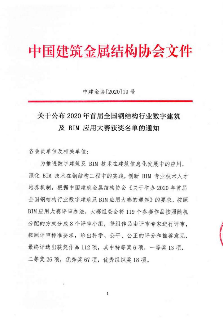 由中國(guó)建筑金屬結(jié)構(gòu)協(xié)會(huì)主辦的《2020年首屆全國(guó)鋼結(jié)構(gòu)行業(yè)數(shù)字建筑及BIM應(yīng)用大賽》評(píng)審結(jié)果于2020年9月15日揭曉。我公司由張睿、高華鵬、楊闖、徐敬文、張帝組成的BIM團(tuán)隊(duì)提交的參賽項(xiàng)目《潤(rùn)邦達(dá)美汽車制造業(yè)供應(yīng)鏈產(chǎn)業(yè)園項(xiàng)目(一期)》斬獲大賽優(yōu)秀獎(jiǎng)。